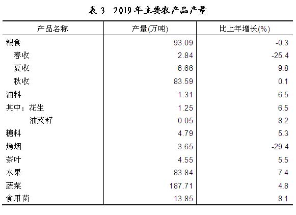 全年粮食产量93.09万吨,比上年减少0.27万吨。其中,稻谷产量77.23万吨,减少1.05万吨。